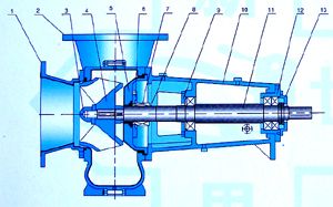 1、前泵蓋 2、泵體 3、葉輪螺母 4、葉輪 5、后泵蓋 6、機(jī)封壓蓋 7、機(jī)械密封組合 8、軸套 9、前軸承壓蓋 10、托架 11、泵軸 12、軸承盒 13、后軸承壓蓋